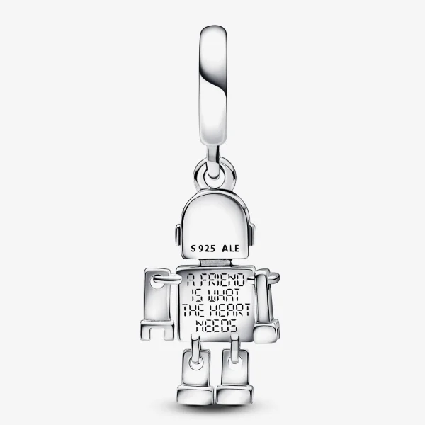 Dóna la benvinguda a un nou amic amb el Charm Penjoll Bot el Robot. Aquest petit company, en plata de primera llei, es presenta embellit amb esmalt de color negre i blanc, així com amb braços i cames mòbils, dents quadrades i ulls rodons que li aporten personalitat. La inscripció del seu tors diu: “A friend is what the heart needs” (Un amic és allò que el nostre cor necessita). Porta aquest charm com a recordatori de com les persones que adores et fan somriure i il·uminen el teu dia.