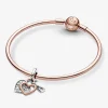 El Pandora Charm Penjoll Doble Candau Cor és una joia que captura l’essència de l’amor etern amb un toc romàntic i elegant. Aquest encantador penjoll està decorat amb un cadenat petit, inspirat en els cadenats que els amants col·loquen als ponts de tot el món per representar el seu amor etern. El cor brillant està elaborat amb plata de primera llei, encastat amb una resplendent circonita cúbica transparent i un recobriment electrolític en or rosa de segona llei de 14k. El cadenat de plata de primera llei té un acabat amb el gravat “Together always” (Sempre Junts), simbolitzant la unió eterna de dos cors enamorats. Aquest encantador penjoll és compatible amb Pandora Moments i és perfecte per expressar sentiments profunds i duradors.