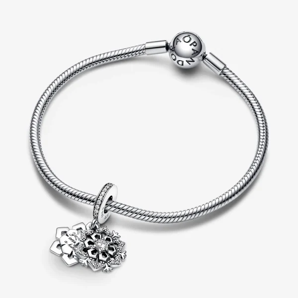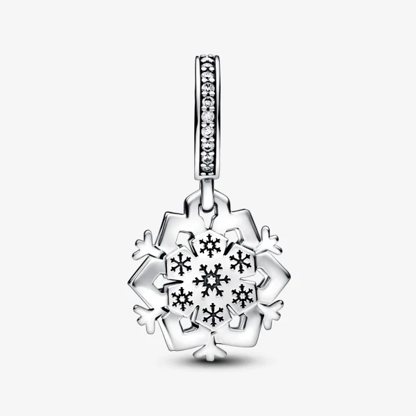 Amb el charm penjant doble floc de neu brillant de Pandora, celebra el que fa que cadascun de nosaltres sigui únic. Aquest encantador penjoll presenta un delicat disseny de flocs de neu elaborat en plata de primera llei, capturant la bellesa dels flocs de neu ballant a l’aire hivernal. Un dels penjolls en forma de floc de neu està adornat amb lluents circonites cúbiques transparents en pavé al voltant d’una gemma central, mentre que l’altre té un gravat que diu “Ets única/o”. El detall retallat i imprès crea una joia intrincada que expressa la singularitat de cadascú. Aquest charm és compatible amb Pandora Moments i és el regal perfecte per expressar l’especial que el teu ésser estimat és per a tu.
