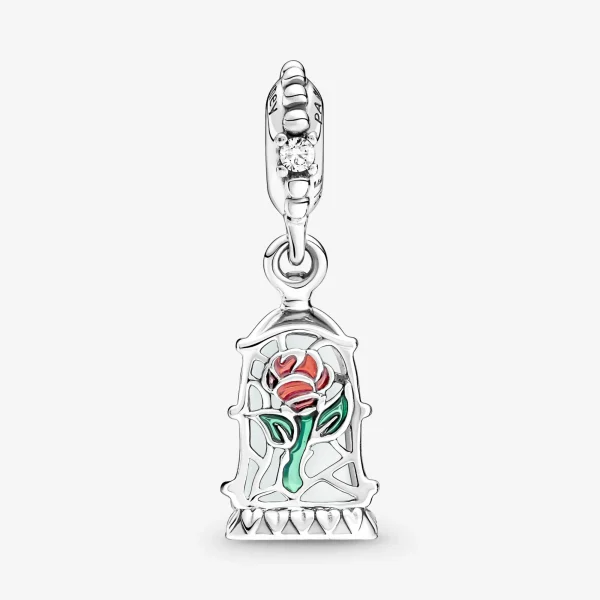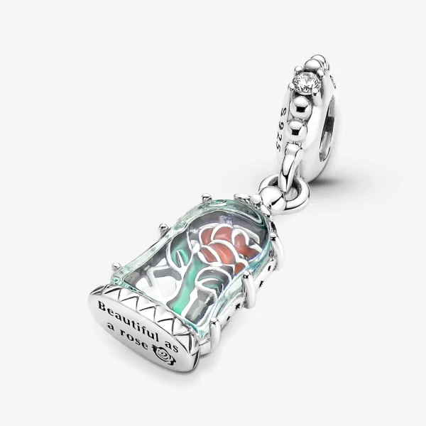 Amb un toc de màgia, et presentem el Charm Penjoll Rosa Encantada de La Bella i la Bèstia de Disney. Aquest encantador penjoll porta una cúpula de vidre de Murano de color blau clar transparent amb estrelles gravades, dins de la qual trobem una rosa retallada amb esmalt de color vermell i verd, aplicat a mà. El penjoll, acabat a mà en plata de primera llei, està decorat amb circonites cúbiques transparents i microesferes a l’anella. A la part inferior, trobem la inscripció “Beautiful as a Rose” (Bella com una rosa). Sense cap mena de dubte, aquest penjoll és un preciós recordatori del poder de l’amor.